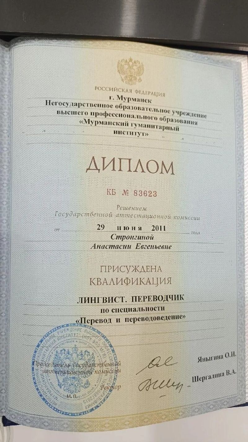 - Мурманский Гуманитарный Институт (МГИ), лингвист, переводчик, 2006–2011 гг.