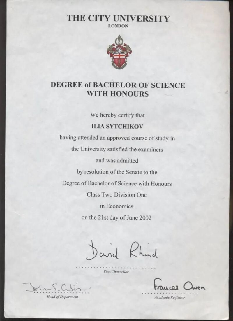 - City University London, Bachelor of Science Honours Degree In Economics, 1999–2002 гг.