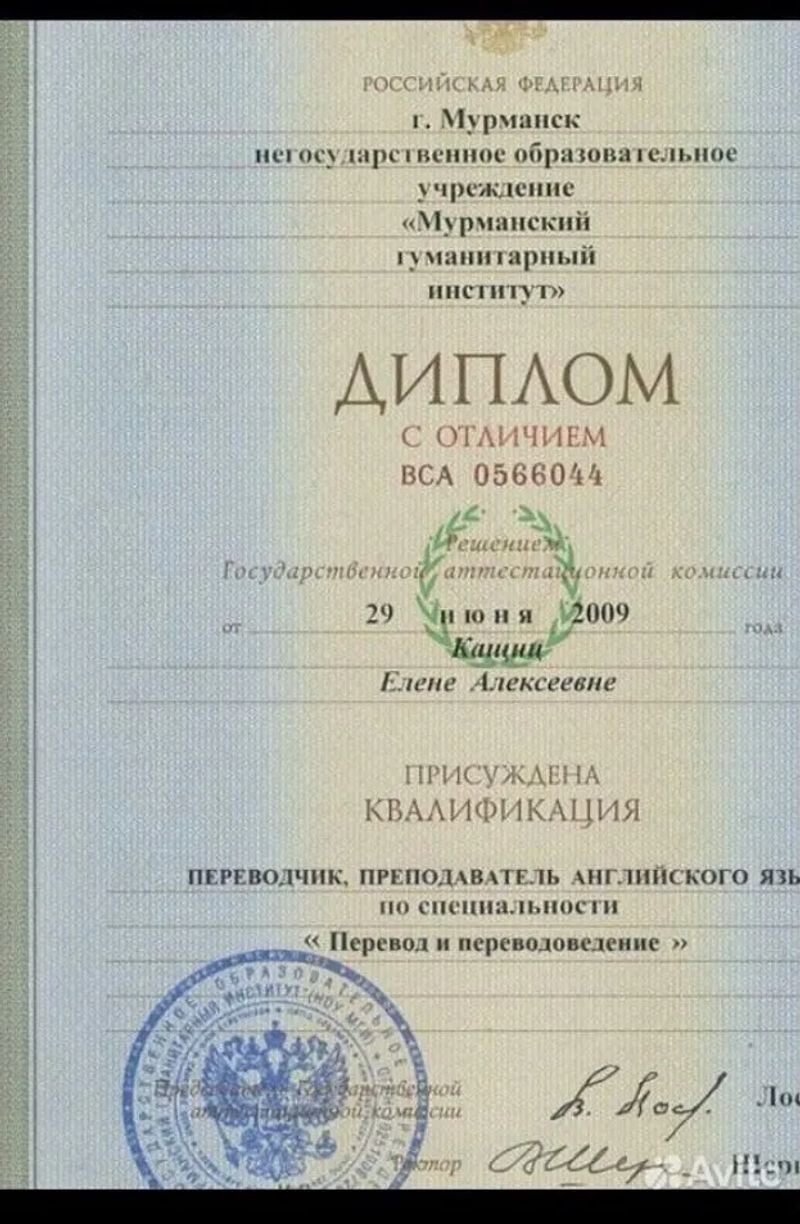 - Муромский гуманитарный институт, переводчик, преподаватель английского языка (диплом с отличием), 2009 г.
