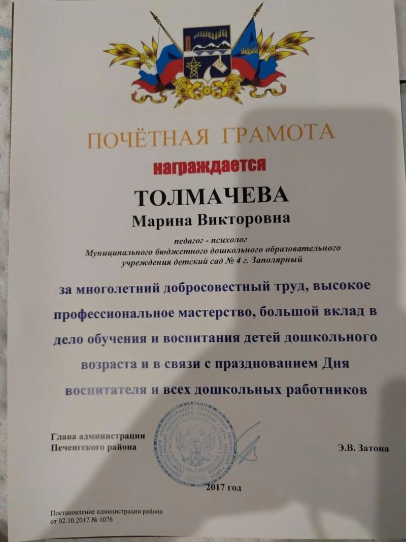 - Почётная грамота главы администрации Печенгского района за многолетний добросовестный труд, высокое профессиональное мастерство, большой вклад в дело обучения и воспитания детей дошкольного возраста и в связи с празднованием Дня воспитателя, 2017 г.