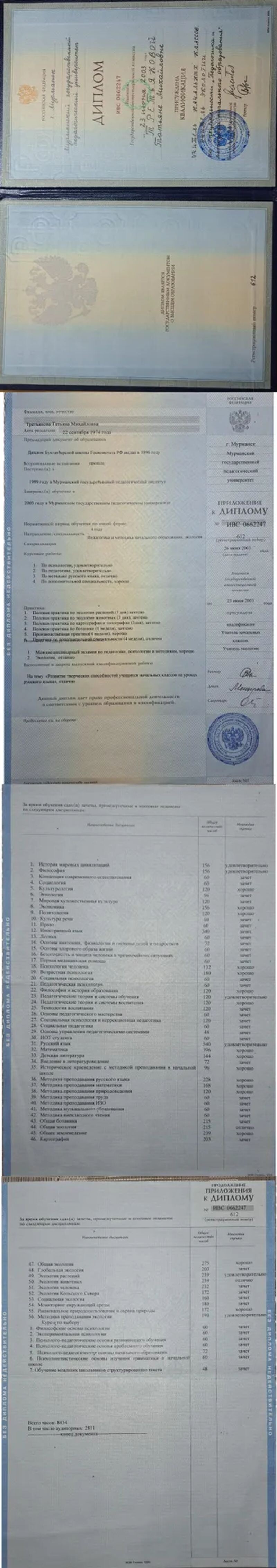 - Мурманский государственный гуманитарный университет, Мурманск Педагогика и методика начального образования, 1999–2003 гг.