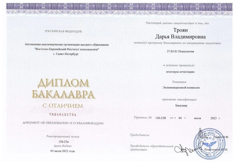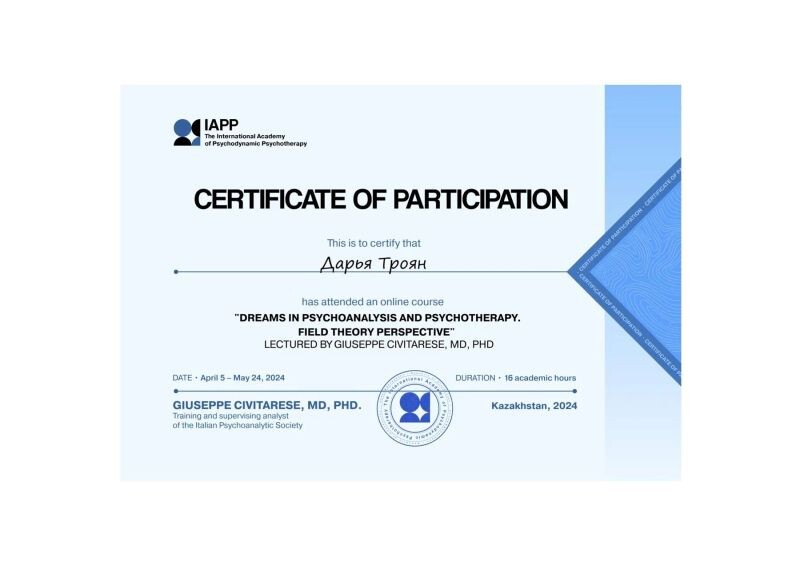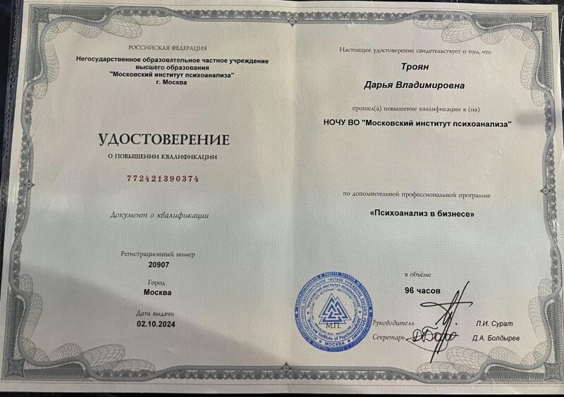 - НОЧУ ВО "Московский институт психоанализа" дополнительная профессиональная программа "Психоанализ в бизнесе", 2024 г.
