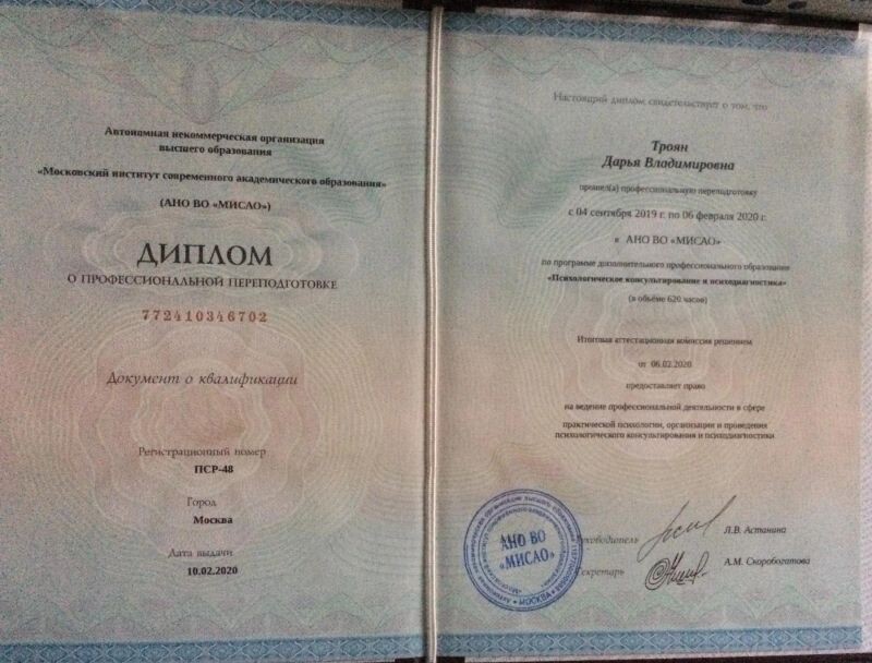 - АНО ВО МИСАО, психологическое консультирование и психодиагностика, психолог-консультант, 2019–2020 гг.