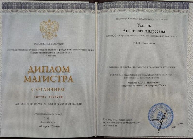 - Негосударственное образовательное частное учреждение высшего образования «Московский институт психоанализа», программа «Основы психологической науки», 2021 г.