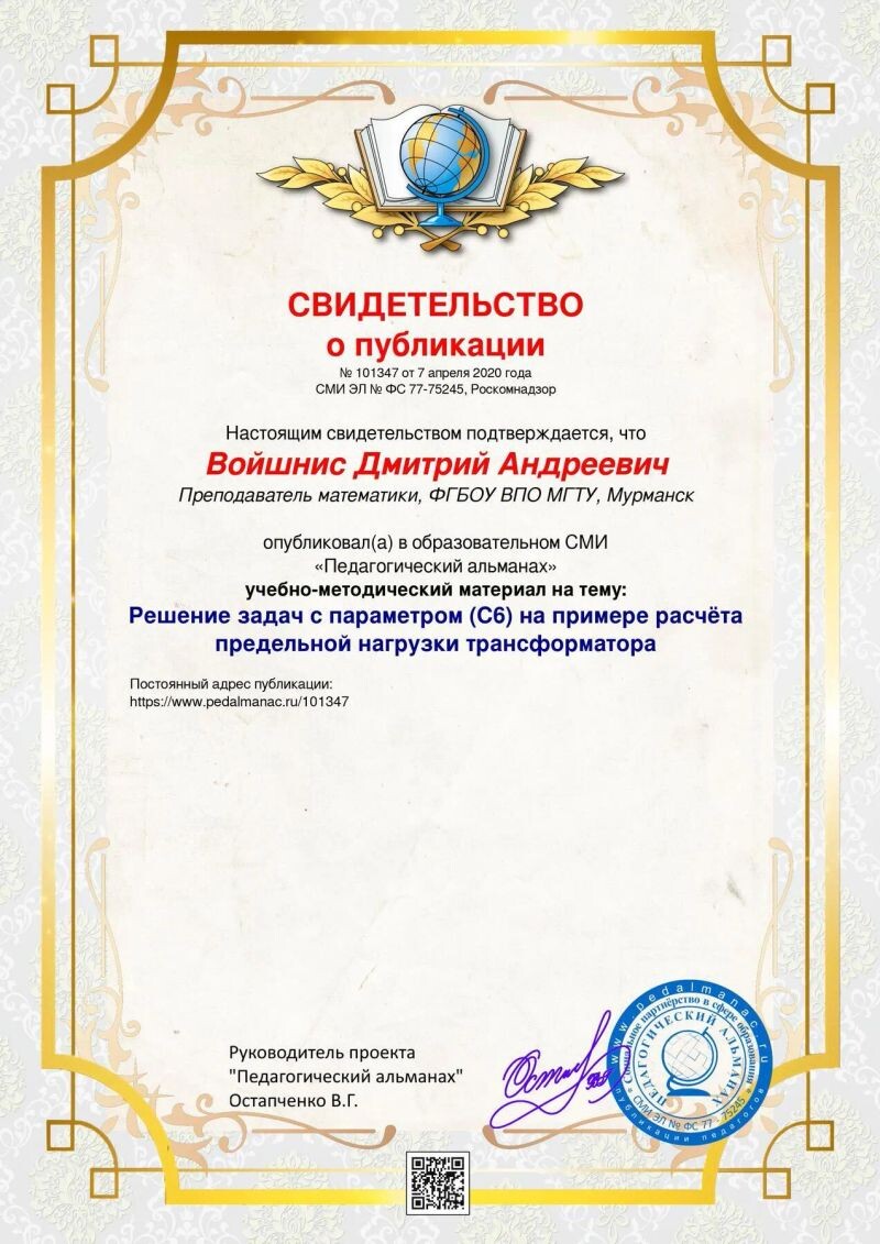 - Свидетельство о публикации учебно-методического материала в СМИ на тему «Решение задач с параметром С6», 2020 г.
