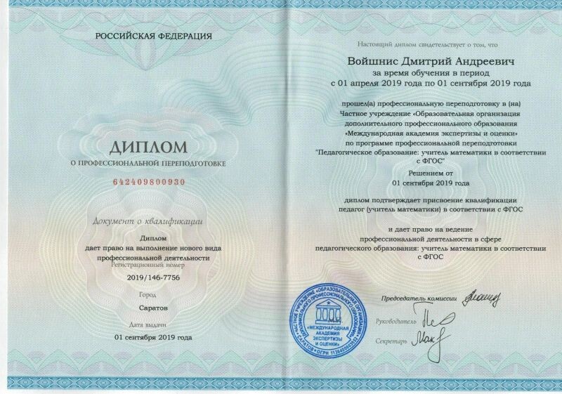 - Диплом о профессиональной переподготовке по программе «Педагогическое образование: учитель математики в соответствии с ФГОС», 2016–2019 гг.