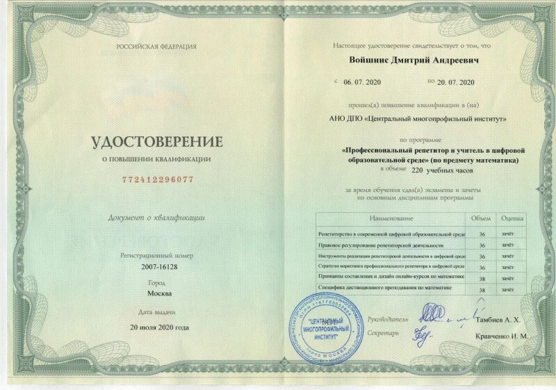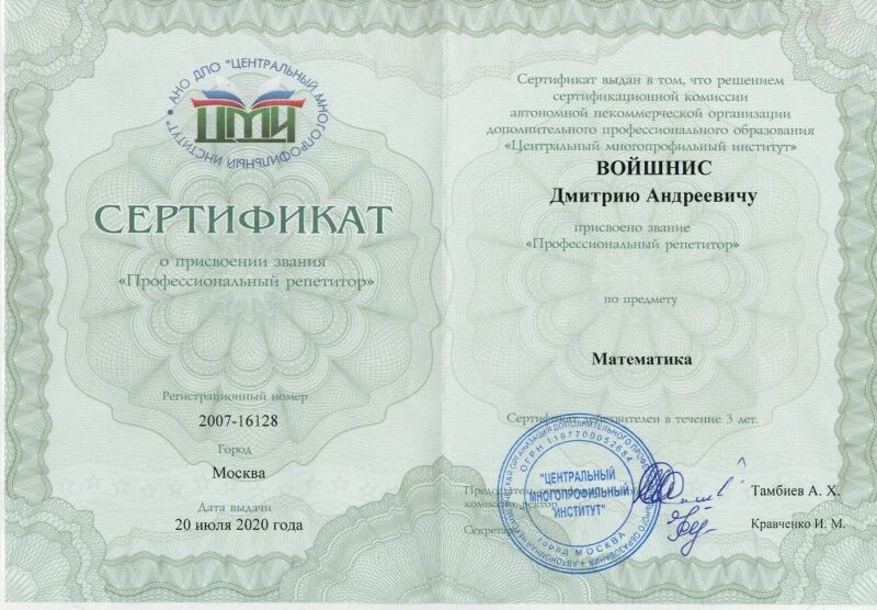 - АНО ДПО «Центральный многопрофильный институт», присовение звания «Профессиональный репетитор» по предмету «Математика», 2020 г.