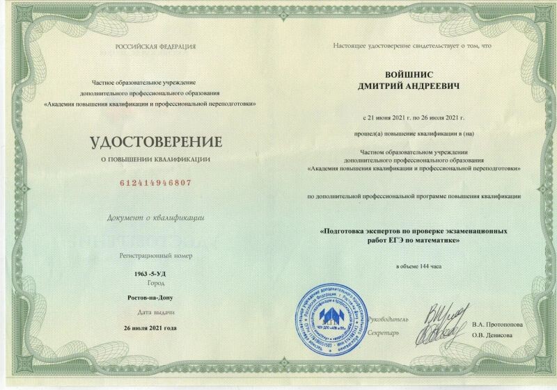 - ЧОУ ДПО «АПК и ПП», повышение квалификации по программе «Подготовка экспертов по проверке экзаменационных работ ЕГЭ по математике», 2020–2021 гг.