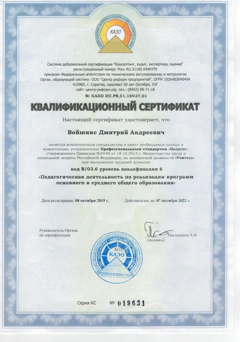 - Система добровольной сертификации «Консалтинг, аудит, экспертиза, оценка», квалификационный сертификат «Педагогическая деятельность по реализации программ основного и среднего общего образования», 2018–2019 гг.
