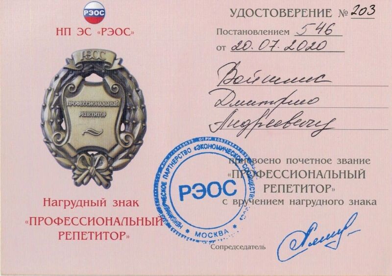 - НП ЭС «РЭОС», присвоение почетного звания «Профессиональный репетитор» с вручением грудного знака, 2020 г.