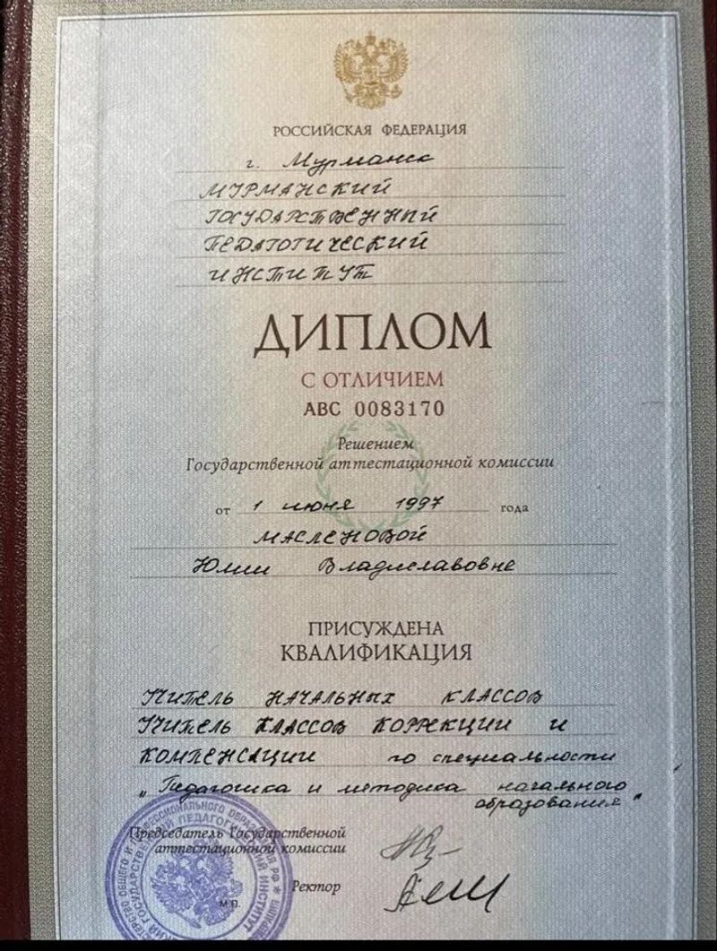 - Мурманский государственный педагогический институт, учитель начальных классов и классов коррекции, 1992–1997 гг.