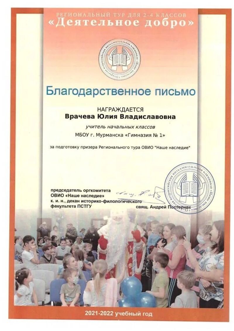 - Региональный тур для 2-4 классов «Деятельное добро», благодарственное письмо за подготовку призёра Регионального тура ОВИО «Наше наследие», 2022 г.