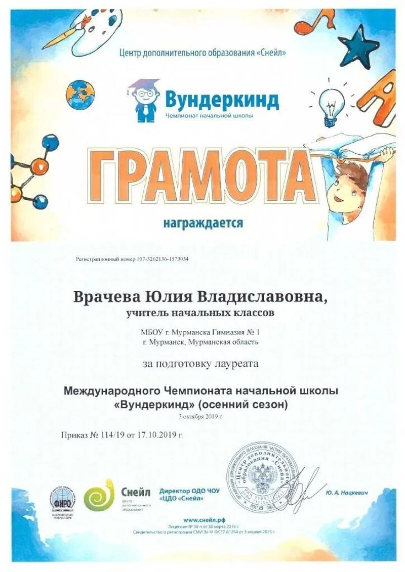 - ЦДО «Снейл», грамота за подготовку лауреата Международного Чемпионата начальной школы «Вундеркинд» (осенний сезон), 2019 г.
