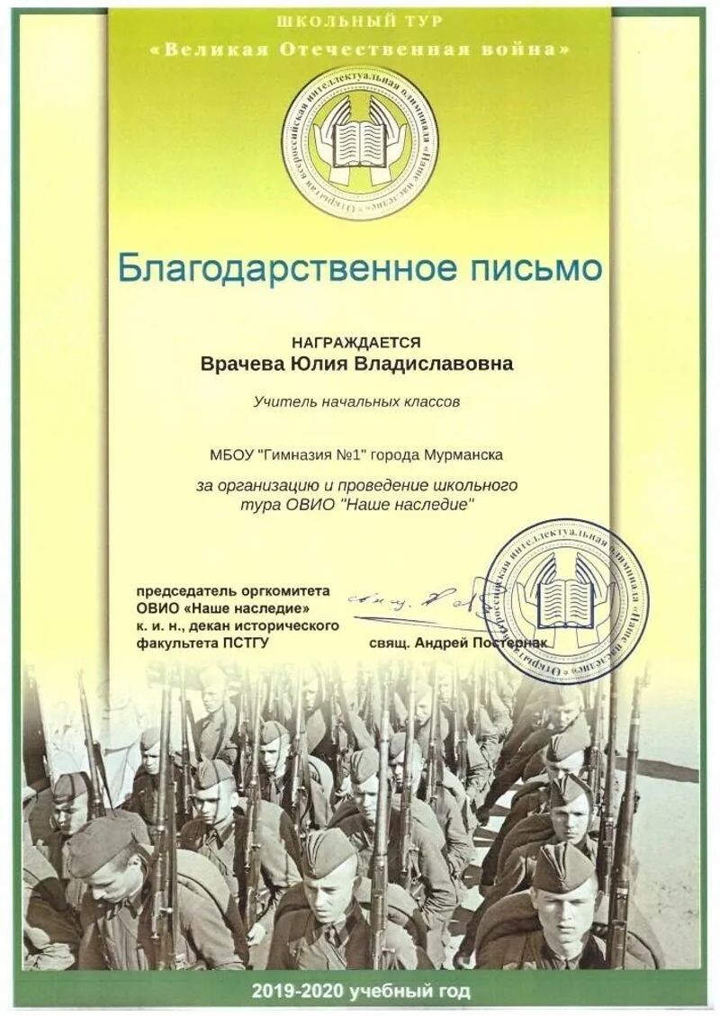 - Школьный тур «Великая Отечественная война», благодарственное письмо за организацию и проведение школьного тура ОВИО «Наше наследие», 2020 г.