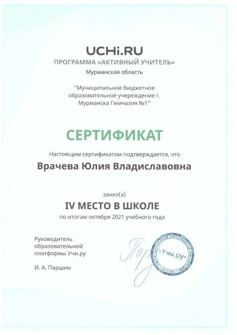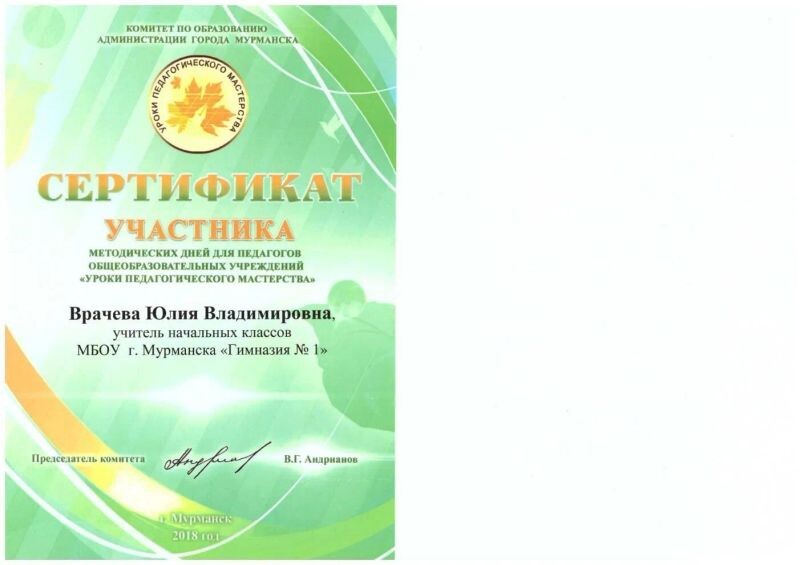- Комитет по образованию Администрации г. Мурманска, участник методических дней для педагогов общеобразовательных учреждений «Уроки педагогического мастерства», 2018 г.