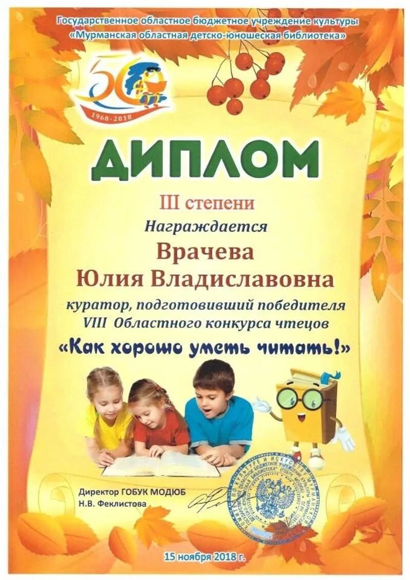 - Мурманская областная детско-юношеская библиотека, диплом III степени за подготовку победителя IVII Областного конкурса чтецов «Как хорошо уметь читать!», 2018 г.