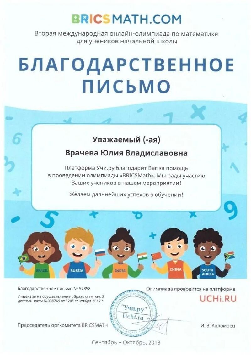 - Uchi.ru, Вторая международная онлайн-олимпиада по математике для учеников начальной школы, благодарственное письмо за помощь в проведении олимпиады BRICSMath, 2018 г.