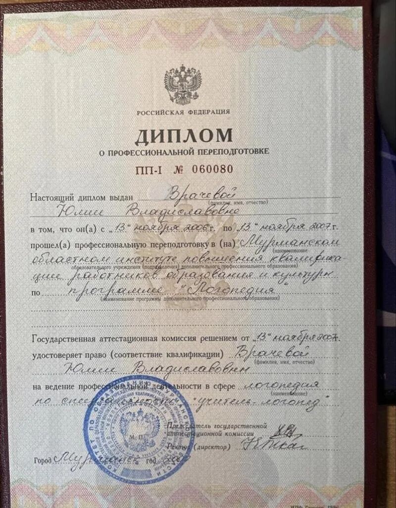 - Мурманский областной институт повышения квалификации работников образования и культуры, логопедия, 2006–2007 гг.