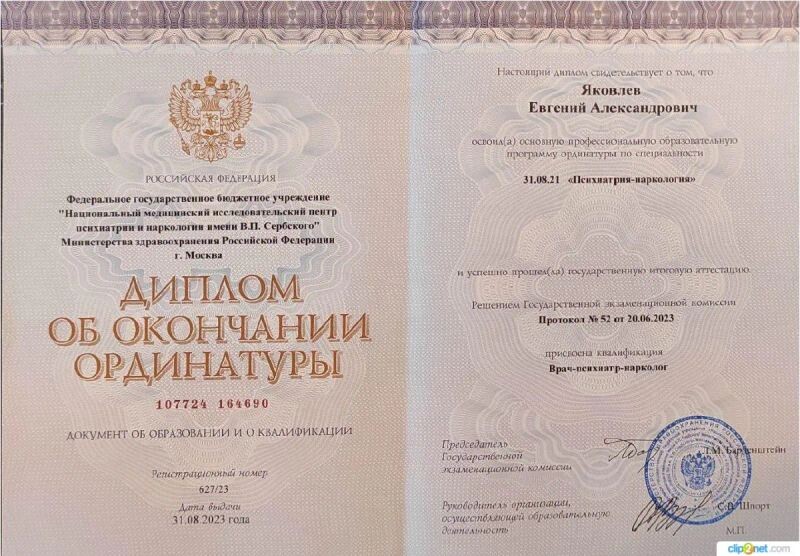 - Государственный научный центр социальной и судебной психиатрии им. В. П. Сербского, психиатр-нарколог, 2021–2023 гг.