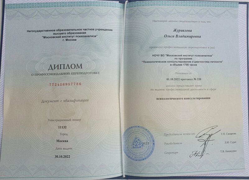 - Московский институт психоанализа, психологическое консультирование и диагностика личности, 1798 часов, 2020–2022 гг.
