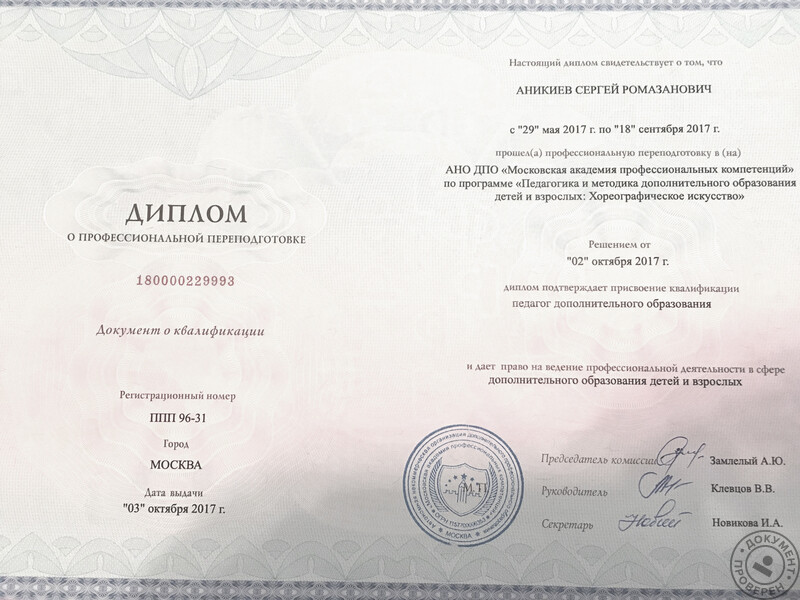 - Московская академия профессиональных компетенций, педагогика и методика дополнительного образования для детей и взрослых, хореографическое искусство (2017 г.).