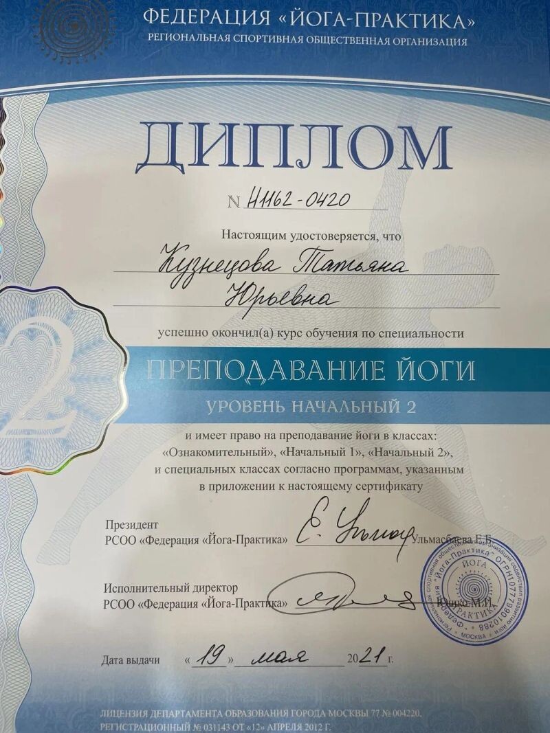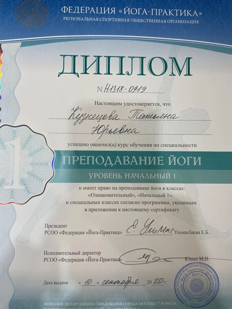 - Федерация «Йога-Практика», преподавание йоги (уровень начальный 2), 2020–2021 гг.