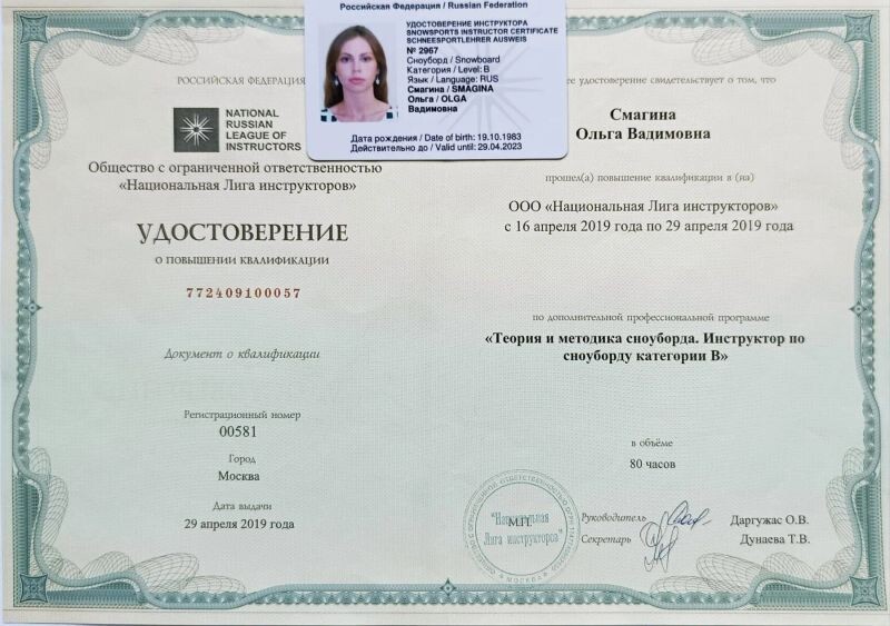 - ООО «Национальная Лига инструкторов», программа «Теория и методика горнолыжного спорта. Инструктор по спорту категории "В"», 2019 г.