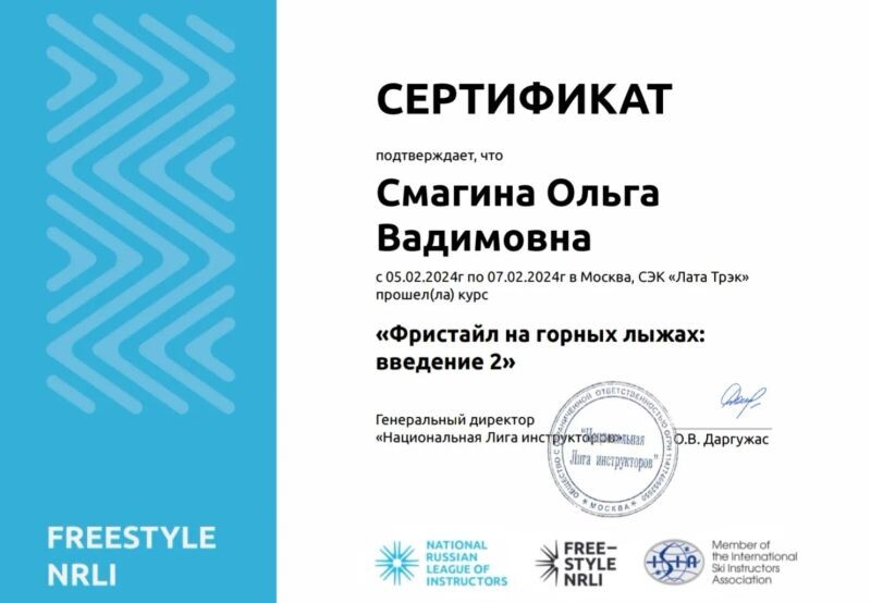 - ООО «Национальная Лига инструкторов», курс «Фристайл на горных лыжах: введение 2», 2024 г.