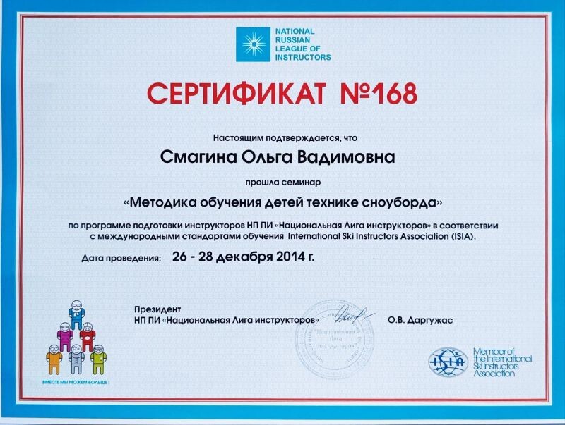 - ООО «Национальная Лига инструкторов», семинар «Методика обучения детей технике сноуборда», 2014 г.