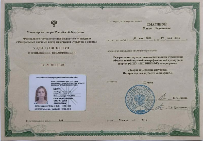 - Федеральный научный центр физической культуры и спорта, программа «Теория и методика сноуборда. Инструктор по сноуборду категории "С"», 2016 г.