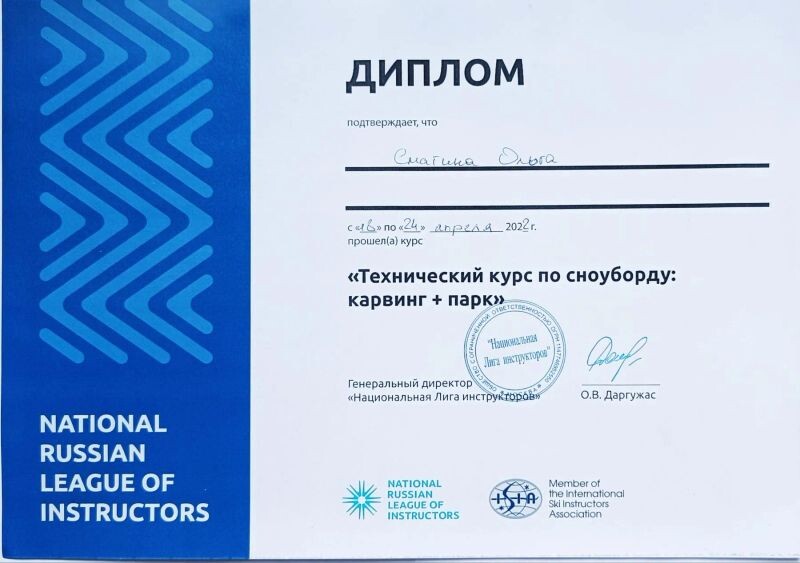 - ООО «Национальная Лига инструкторов», курс «Теоретический курс по сноуборду: карвинг + парк», 2022 г.